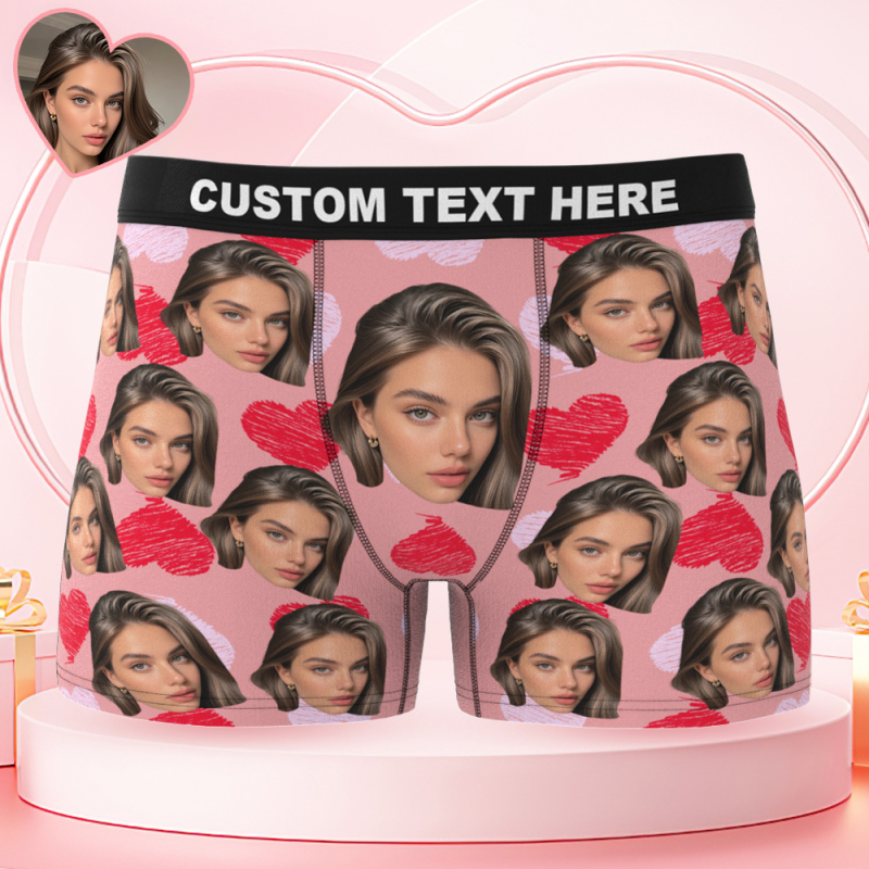 Custom Big Face Boxer Shorts Personalized Colorful Waistband Boxer Briefs Red and Pink Hearts Christmas Gifts for Boyfriend