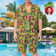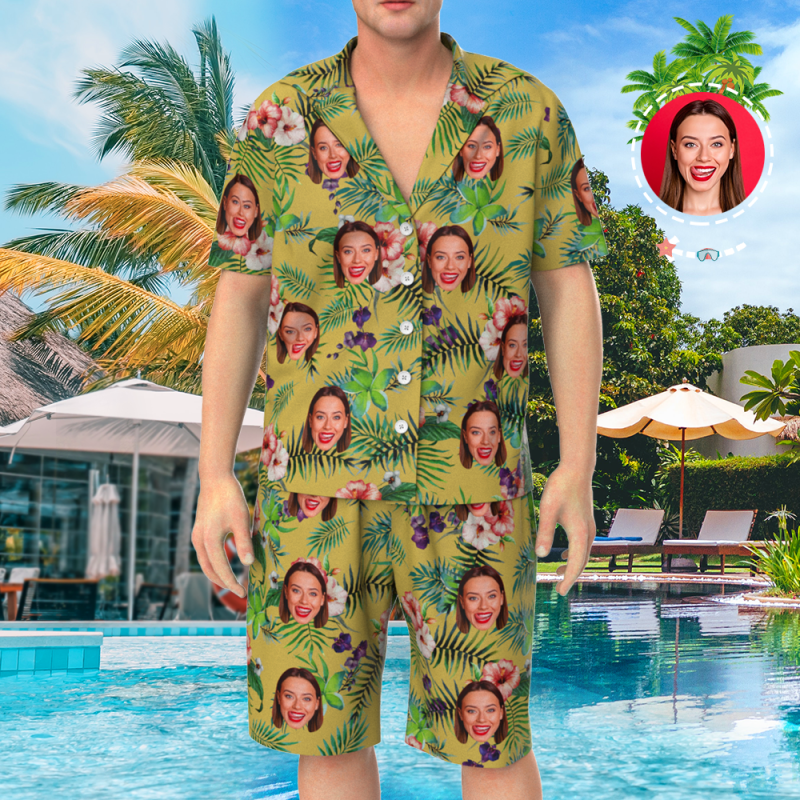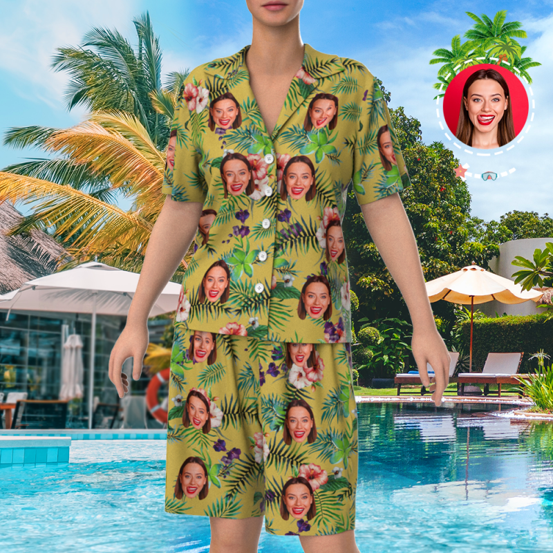 Custom Face On Pajamas Set, Short Sleeve Sleepwear, Button-Down Nightwear - Yellow