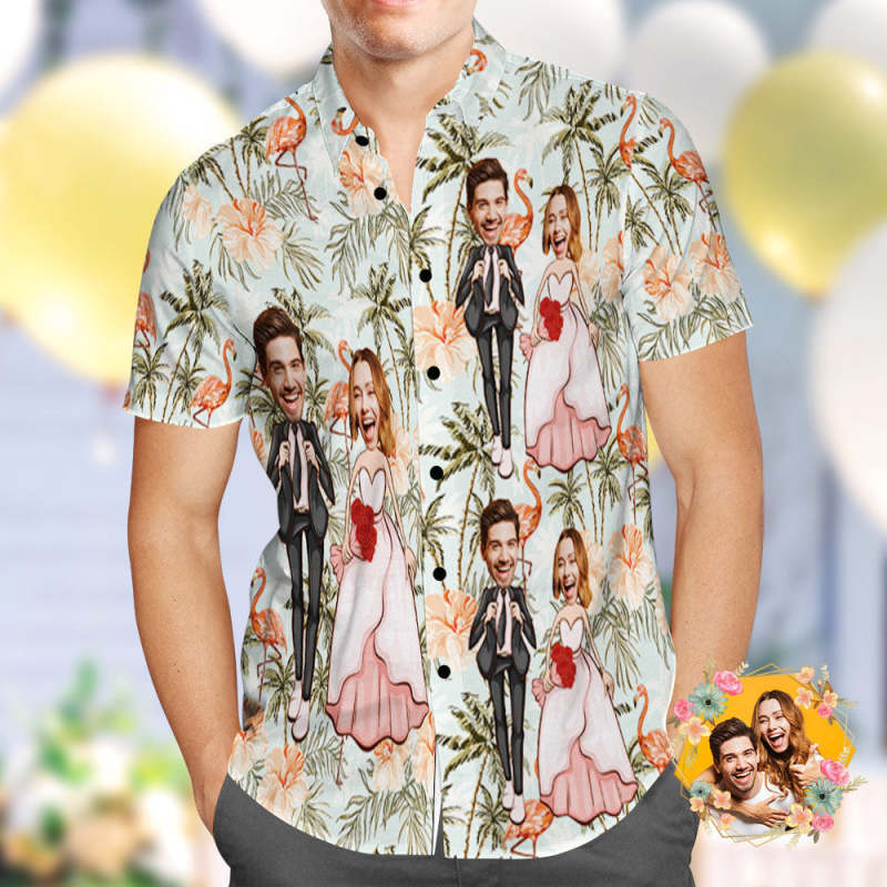Custom Hawaiian Shirt Personalized Flamingo and Coconut Trees Wedding Hawaiian Shirt