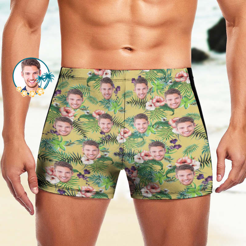 Custom Men's Swim Boxer Shorts, Hawaiian Face Swim Trunks, Peseronalized Swim Briefs - Yellow
