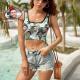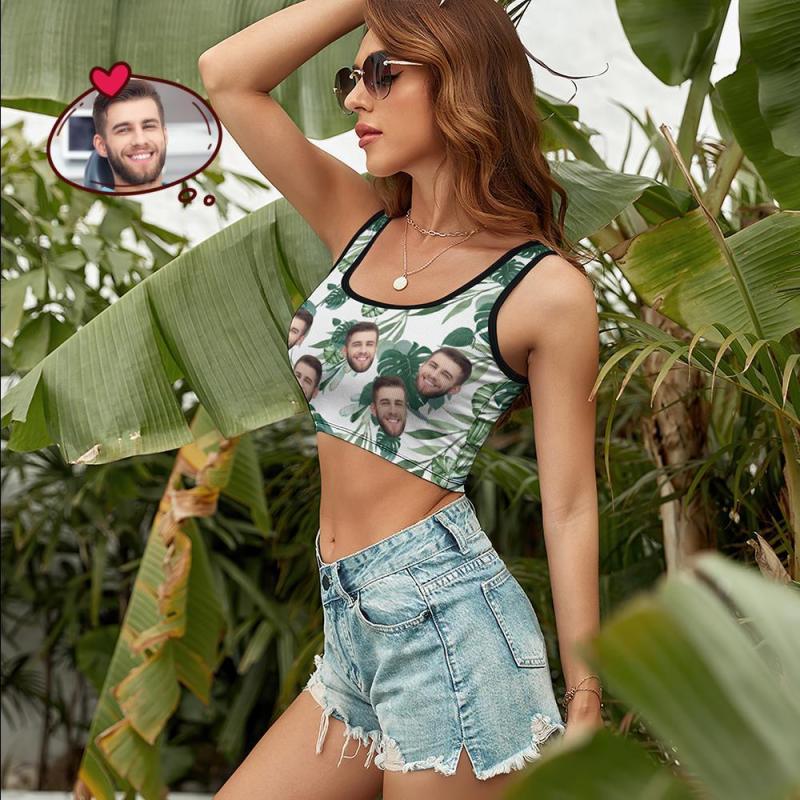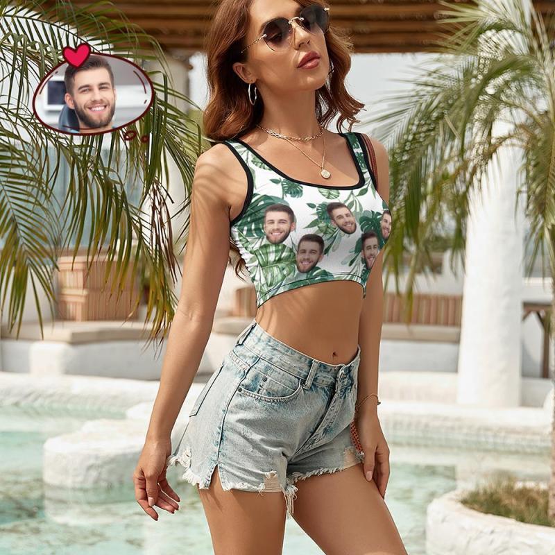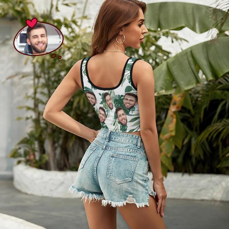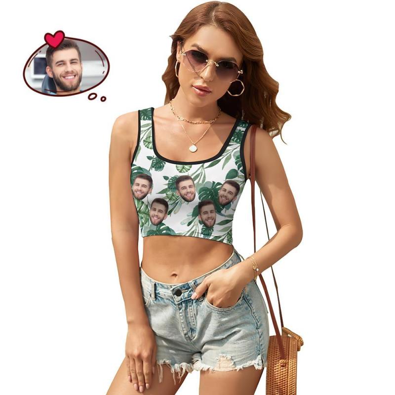 Custom Women's Photo Short Vest Personalized Face Tank Top Crop Top - Green Leaves
