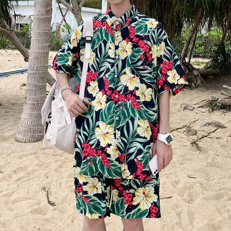 Hawaiian Shirts Print Leaves and Flowers On Black Background Aloha Beach Shirts For Men