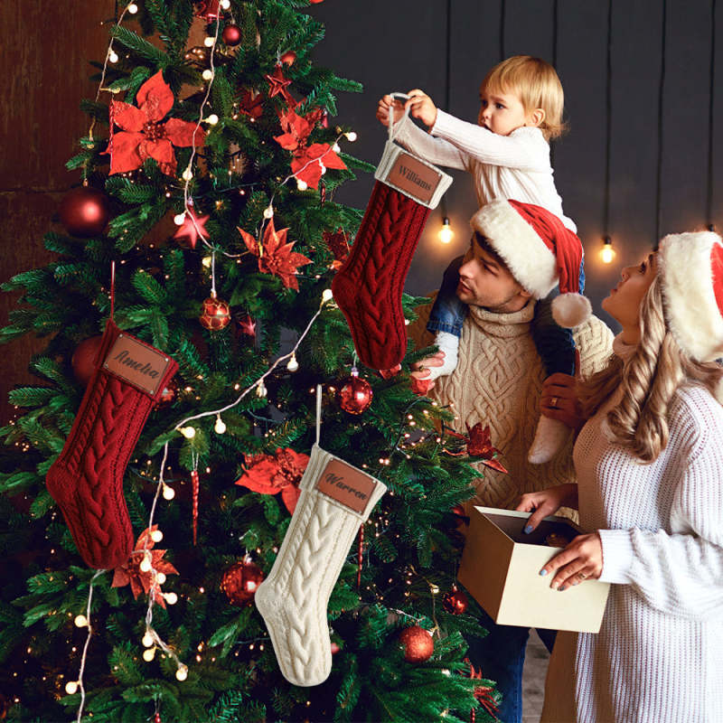 Personalized Christmas Stocking with Name Leather Patches Knitted Xmas Stockings Decoration