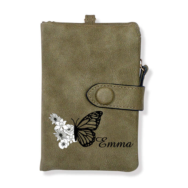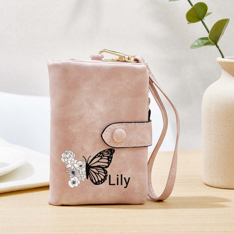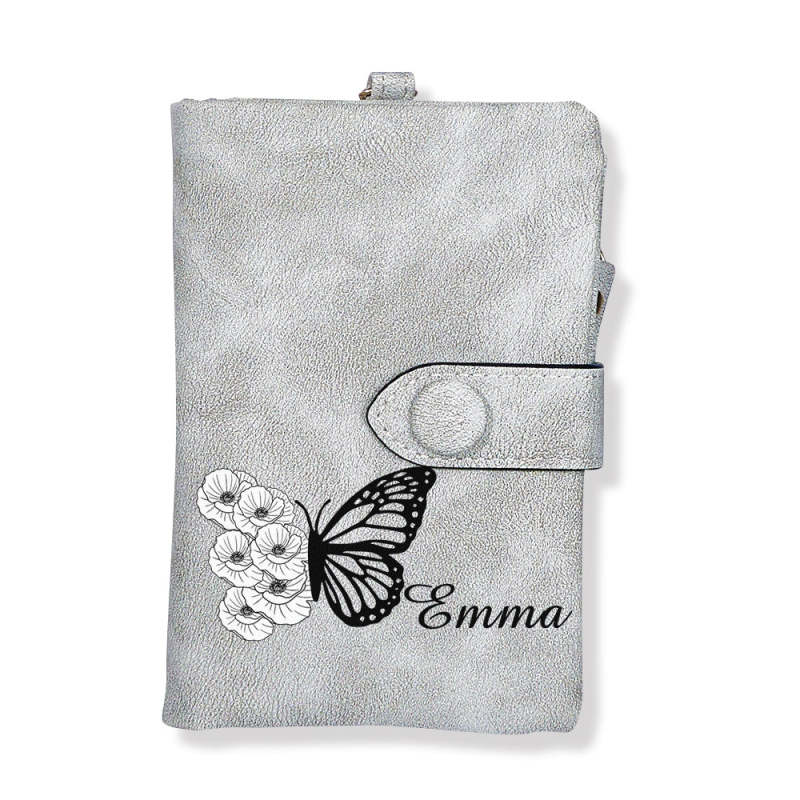 Custom Tri-Fold Butterfly Birth Flower Leather Wallet with Coin Holder Personalized Mother's Day Gift for Woman