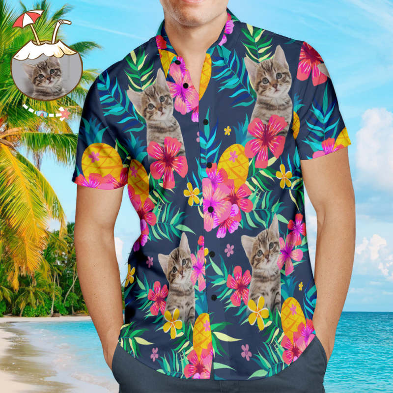 Custom Cat Face Men's Hawaiian Shirts Dark Blue Hawaiian Shirt for Pet Lover