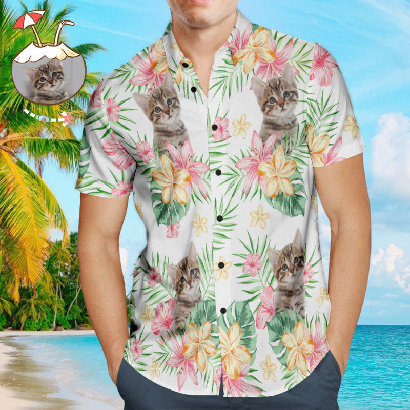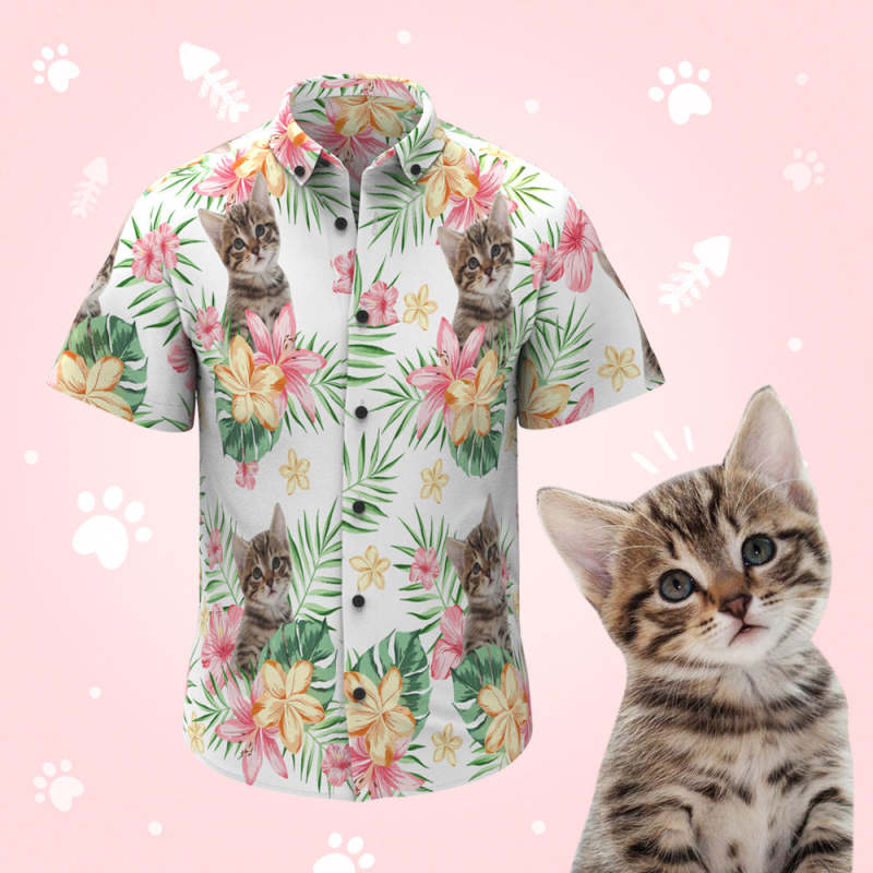 Custom Cat Face Men's Hawaiian Shirts with Pink Flower for Pet Lover
