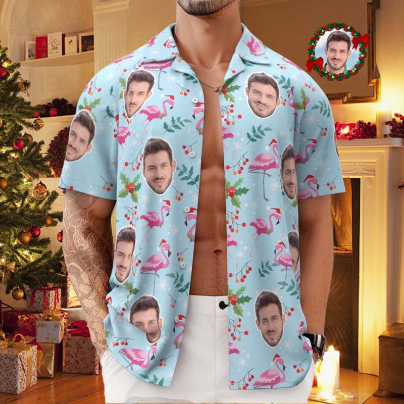 Custom Face All Over Print Men's Hawaiian Shirt Christmas Flamingo Seamless Pattern Hawaiian Shirt