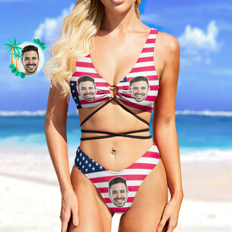 Custom Face Bikini Swimming Costume Women's Chest Strap Bathing Suit Personalized Photo Bikini Gift - American Flag