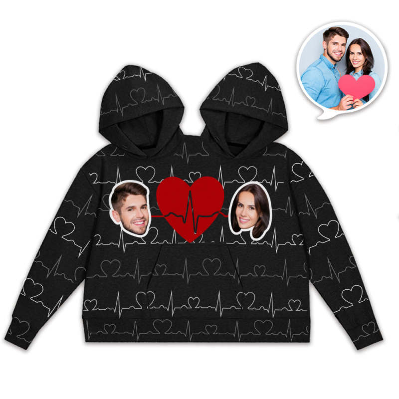 Custom Face Couple's Heartbeat One Piece Sweatshirt Photo Intimate Hoodie Gift For Love