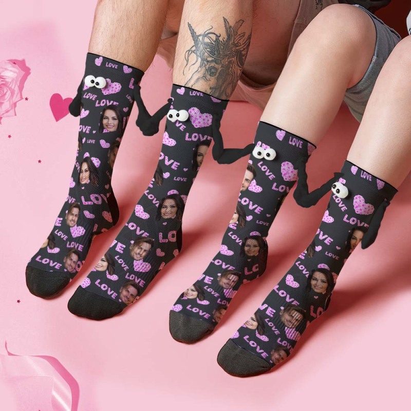 Custom Face Socks Funny Doll Mid Tube Black Socks Magnetic Holding Hands Socks Pink Love Valentine's Day Gifts