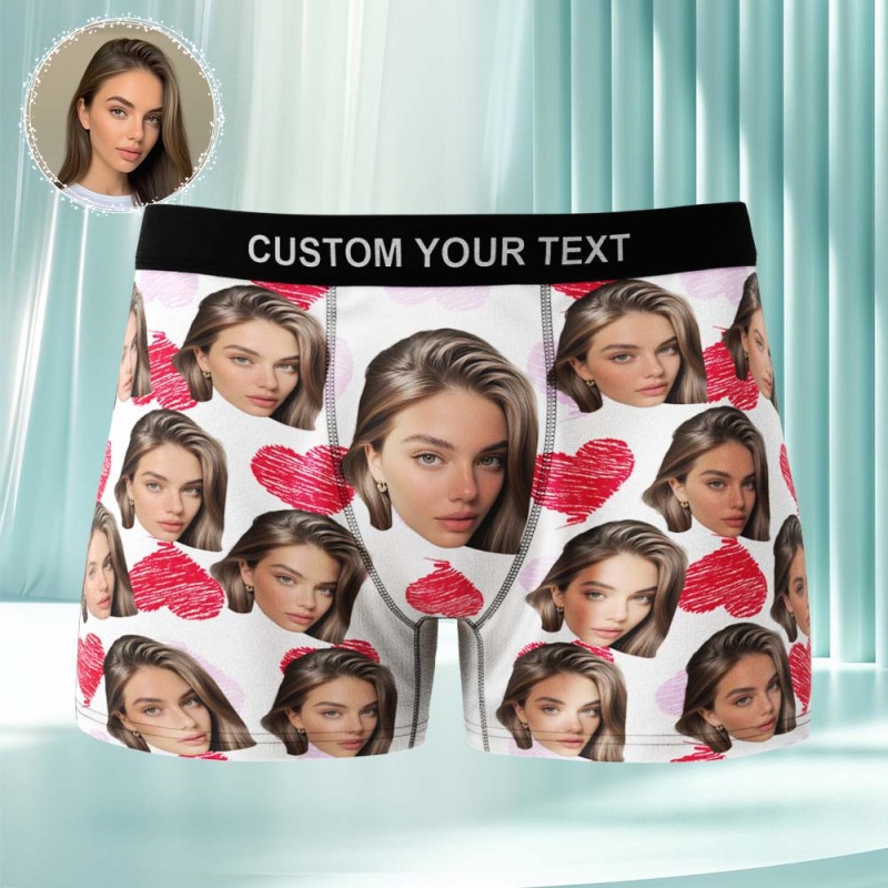 Custom Face Underwear Men's Boxer Briefs Personalized Photo Boxers Breathable Ice Silk Red and Pink Heart