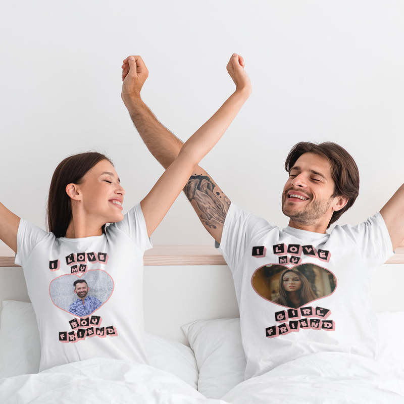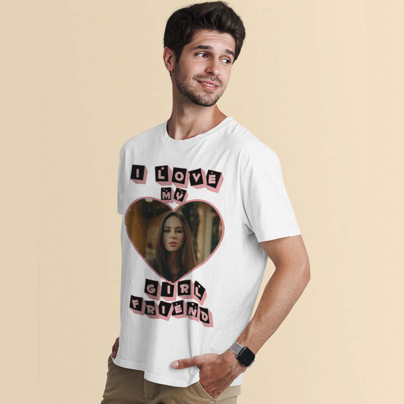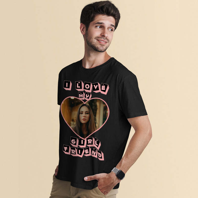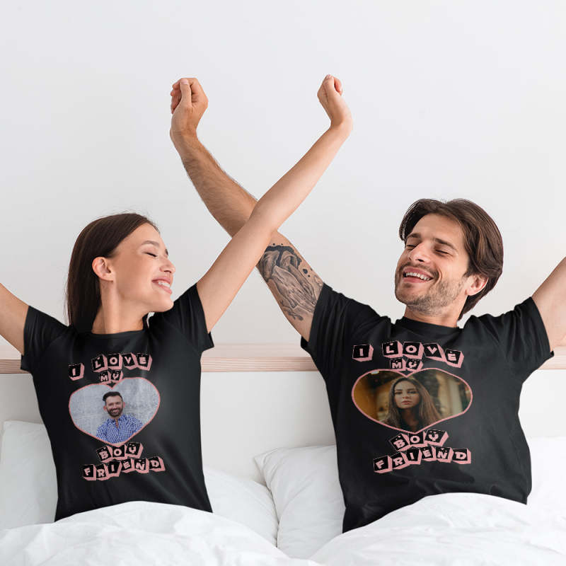 Custom T-Shirt Personalized Couple Photo T-shirt Pink Heart I Love My Girlfriend/Boyfriend