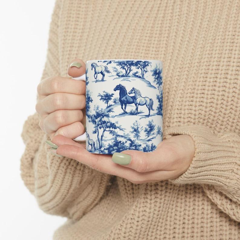 Horse French Toile de Jouy Mug - Elegant Equestrian Gift for Horse Lovers, Blue Toile Coffee Cup Gifts for Horse Mom, Chinoiserie Tea Cup