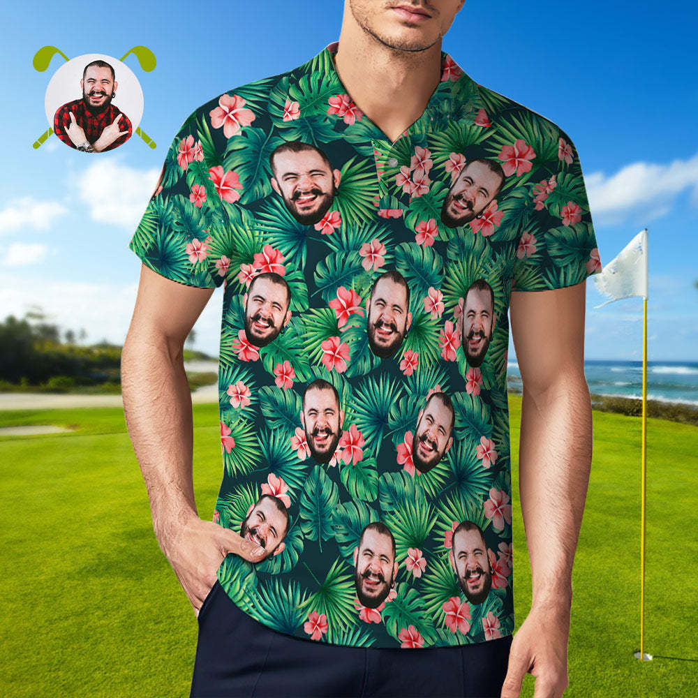 Men's Custom Face POLO Shirt Personalized Green Golf Shirts For Him Hawaiian Pink Flower
