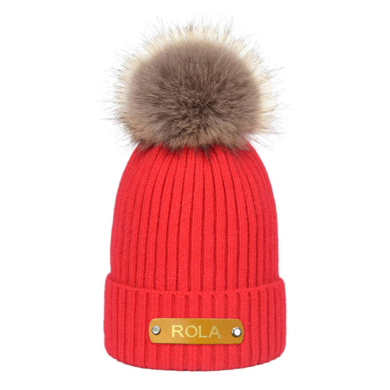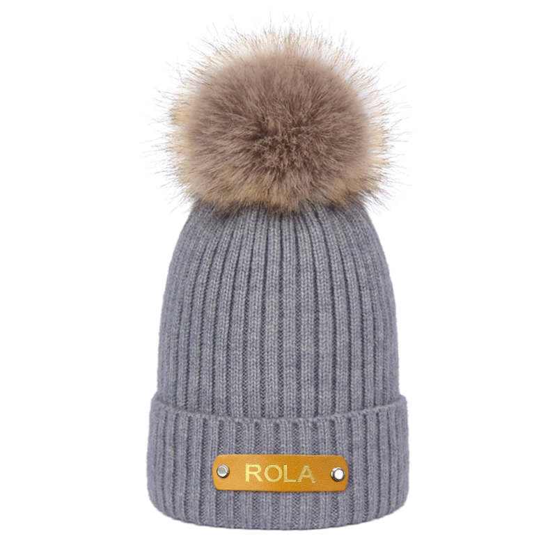Personalized Kid Beanie Hat Custom Name Leather Patch Toddler Knit Cap for Girls Boys